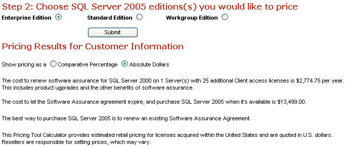 Por outro lado, se comprar o SQL Server Standard Edition sem o Software Assurance, o valor será de $2.249.00 para SQL Server 2000 e $2.799.00 para SQL Server 2005. Neste caso, comprando o SQL Server 2000 agora não dará direito a atualização para o SQL Server 2005 quando o mesmo estiver disponível.