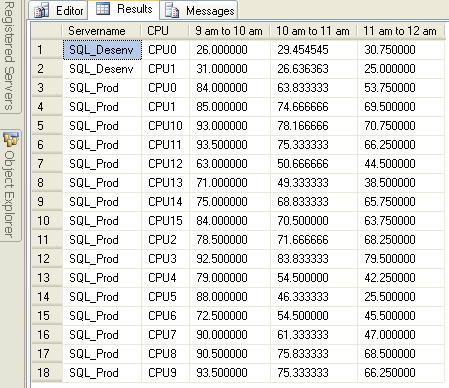 Como um exemplo, na figura abaixo temos o percentual de consumo de CPU para os servidores SQL_Desenv e SQL_Prod. Note que o consumo é apresentado para cada uma das CPUs nos horários entre 9 e 10AM, 10 e 11AM e 11 e meio-dia. Bom, com isso fica fácil você manter um histórico para acompanhar a utilização do seu servidor.