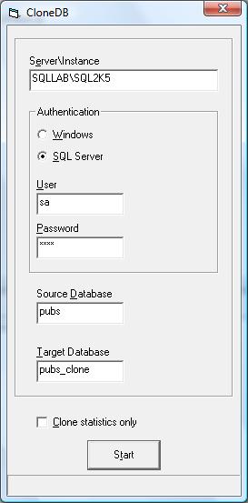Ao executar o utilitário você deverá informar o nome do servidor, login e senha, nome do banco de dados atual e um nome para o novo banco de dados (o clone).