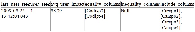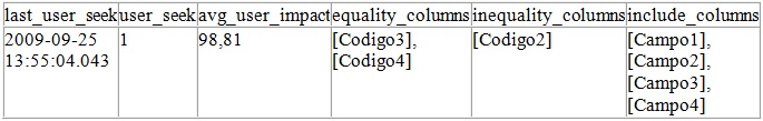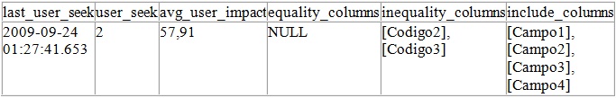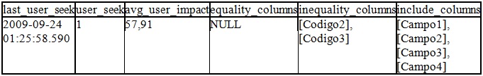 Usando o resultado da procedure podemos ver também as colunas que foram sugeridas como índice: