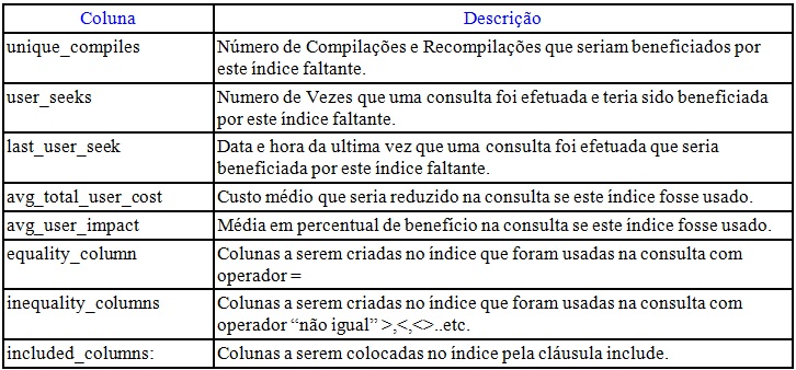 Esta procedure basicamente faz o seguinte. Passado uma tabela como parâmetro, ela me informa quais os índices sugeridos para as consultas feitas nela.Ela me retorna algumas colunas, mas as mais importantes são: