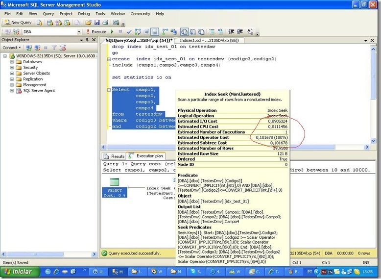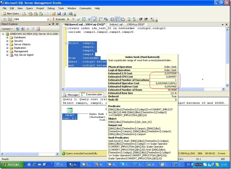 Podemos ver que além do logical reads, o custo de IO e cpu aumentaram. Ou seja, o otimizador sabe o que faz! Mas eu precisava fazer mais um teste, usando where com operador igual (=)…